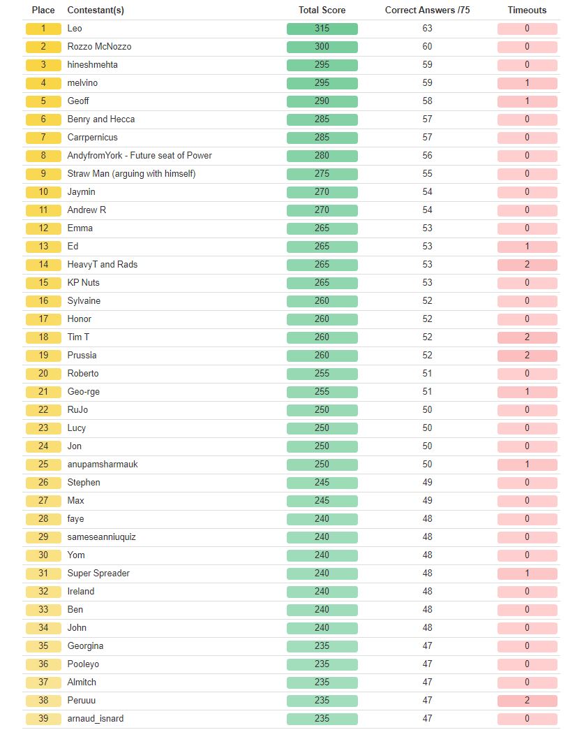 The rest of you – the Halloween round is underway so get on it. I leave you with the top half of the Summer Quiz table…